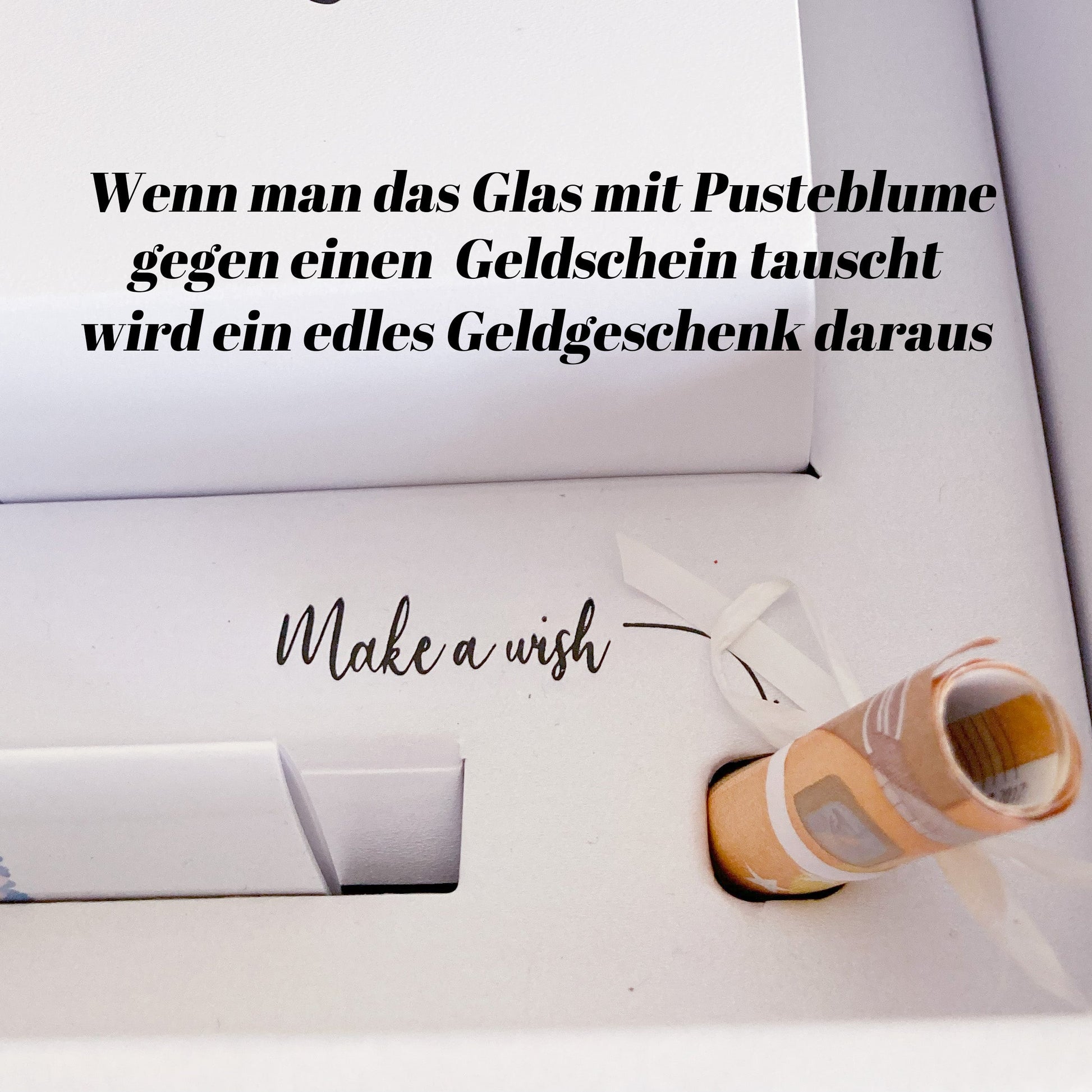 - Option 1: Replace the glass with the dandelion with a rolled up banknote (or several). The sweet "Make a wish" embossing is sure to bring a smile to the recipient's face.