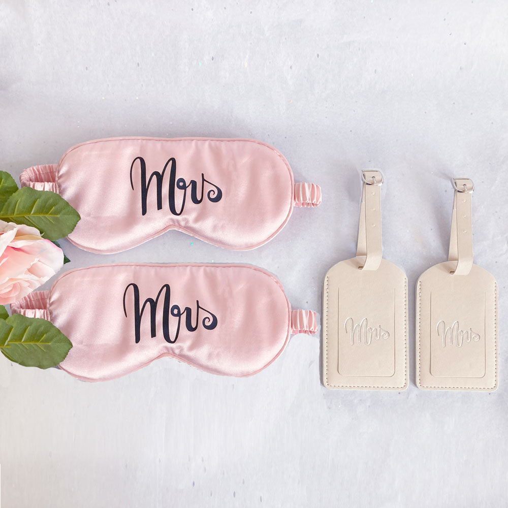 - Option 2: Honeymoon set consisting of two sleep masks and 2 luggage tags (both personalizable)