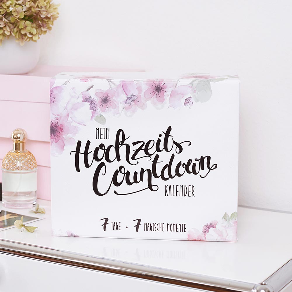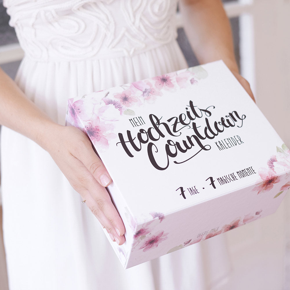 Mit deinen Wunschwörtern personalisiert genießt die Verlobte ihre letzten 7 Tage vor der Hochzeit mit der Countdown-Box - in jedem Türchen sind: