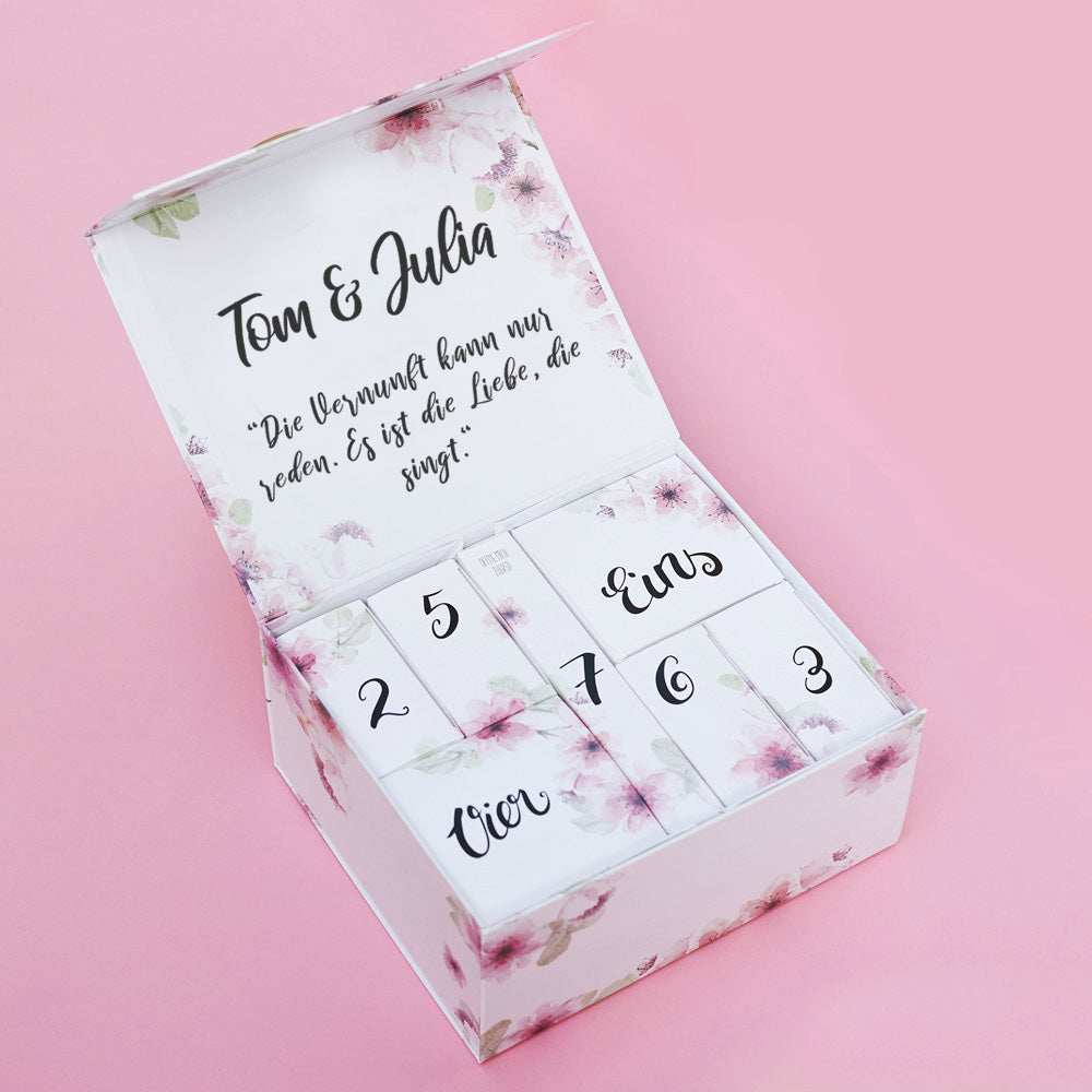 Es gibt auch den Hochzeits-Countdown-Kalender ohne Personalisierung - dort erfährst du alle Details über die Box selbst.